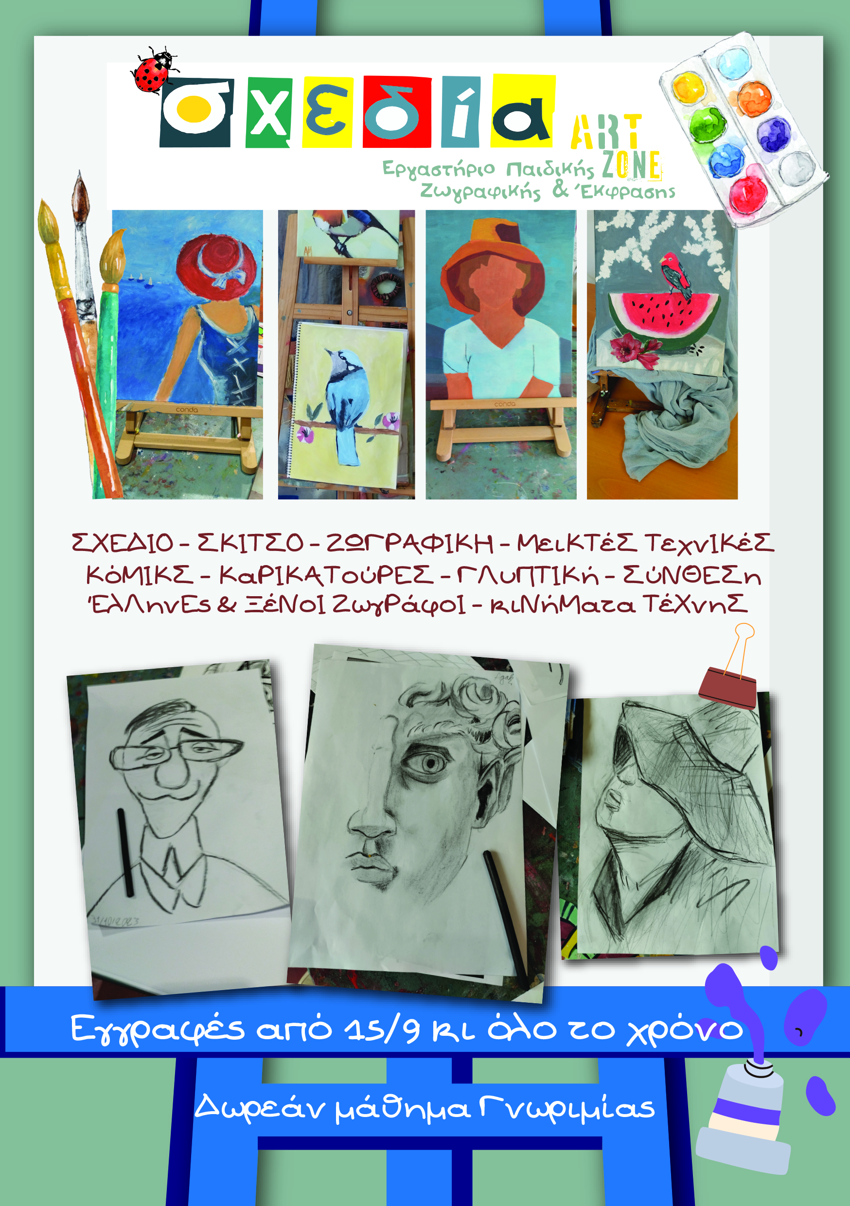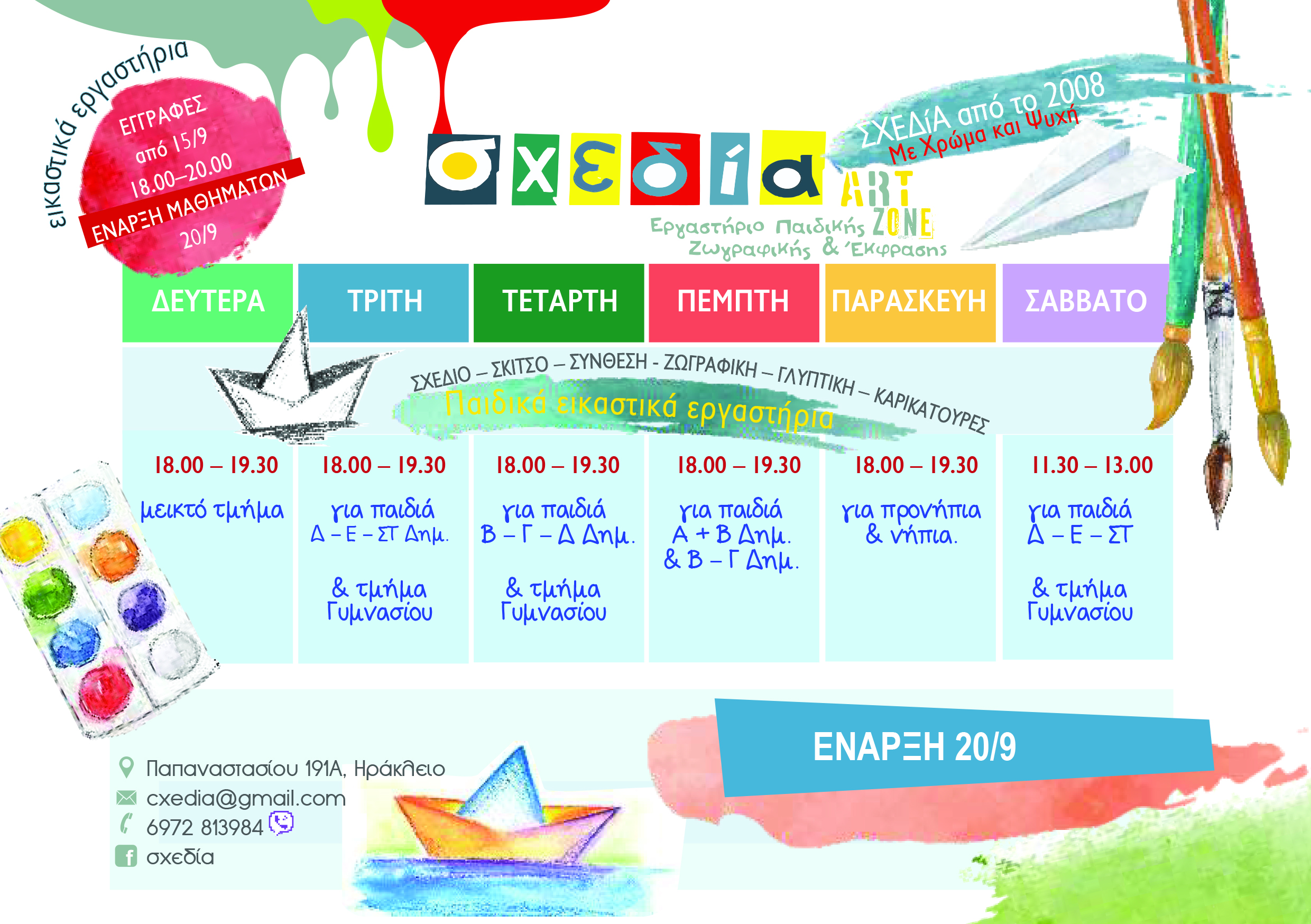 Το Εργαστήριο Παιδικής Ζωγραφικής & Έκφρασης ΣΧΕΔίΑ ταξιδεύει με επιτυχία και αστείρευτη δημιουργικότητα από το 2008 στον κόσμο της τέχνης, με οδηγό την αγάπη για τη δημιουργία και επιβάτες τους μικρούς μας καλλιτέχνες.